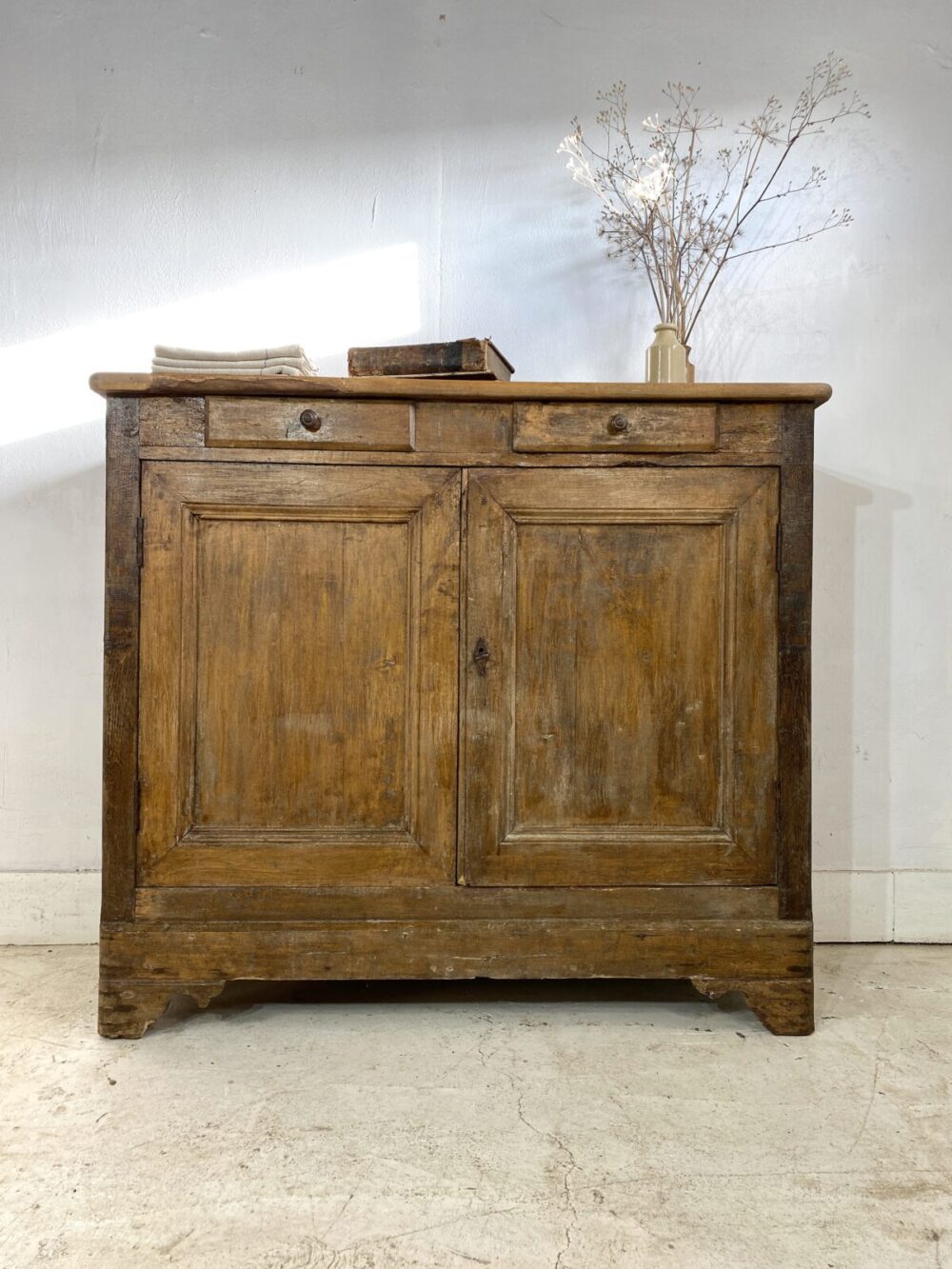 The cupboard is of larger proportions. Two petite drawers sit above a large shelved space. A lifetimes selection of naive repairs enhance charm and character